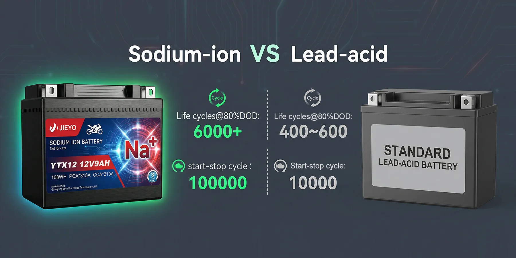 This automotive cranking sodium-ion battery features 6,000+ cycles@80%DOD and 100,000 start-stop cycles, 10× longer life than lead-acid batteries (only 400–600 deep cycles & 10,000 start-stop cycles).