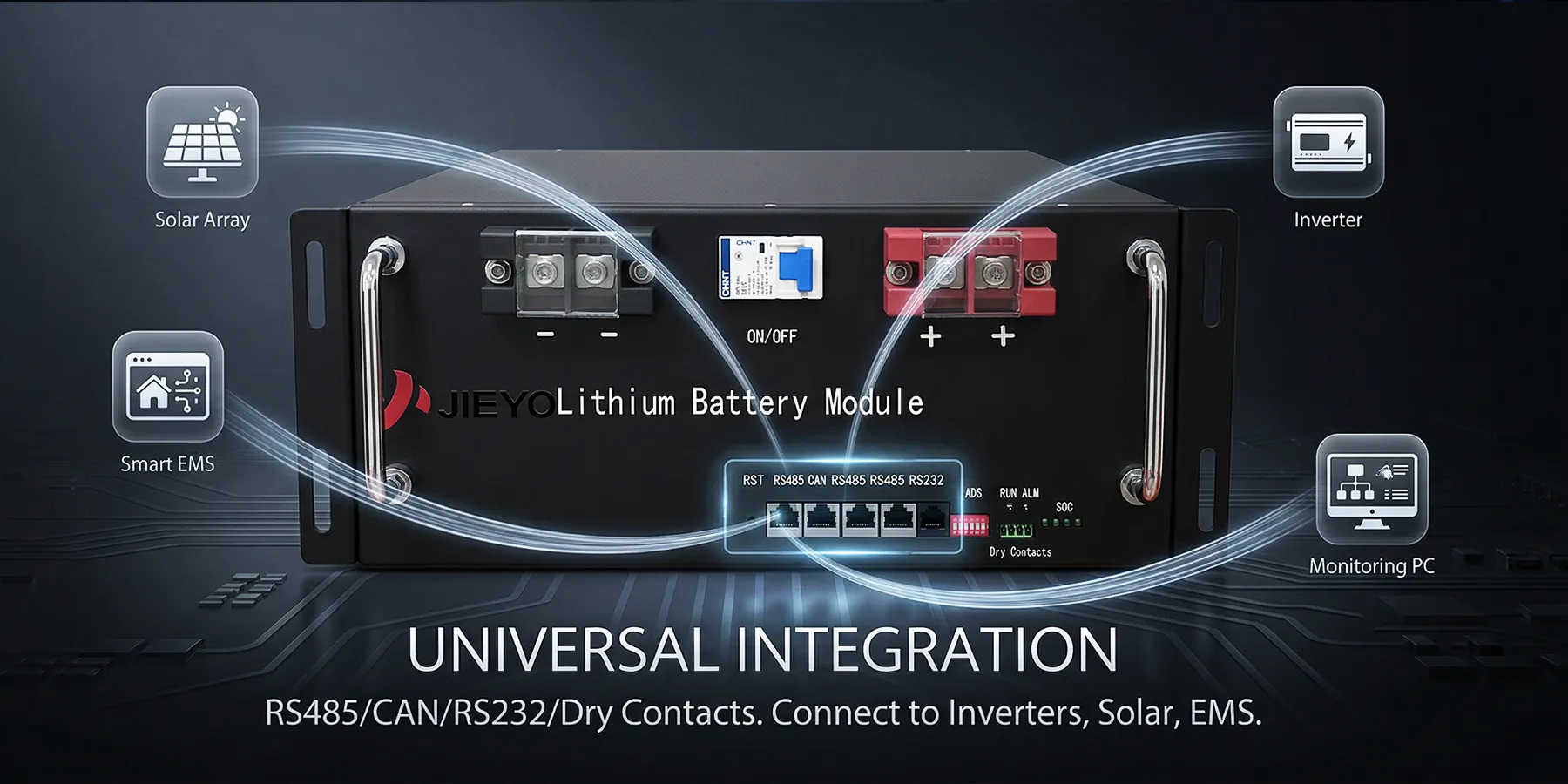 Equipped with RS485/CAN/RS232 ports and dry contact, enabling seamless integration with inverters, solar panels, and smart home energy management systems (EMS).
