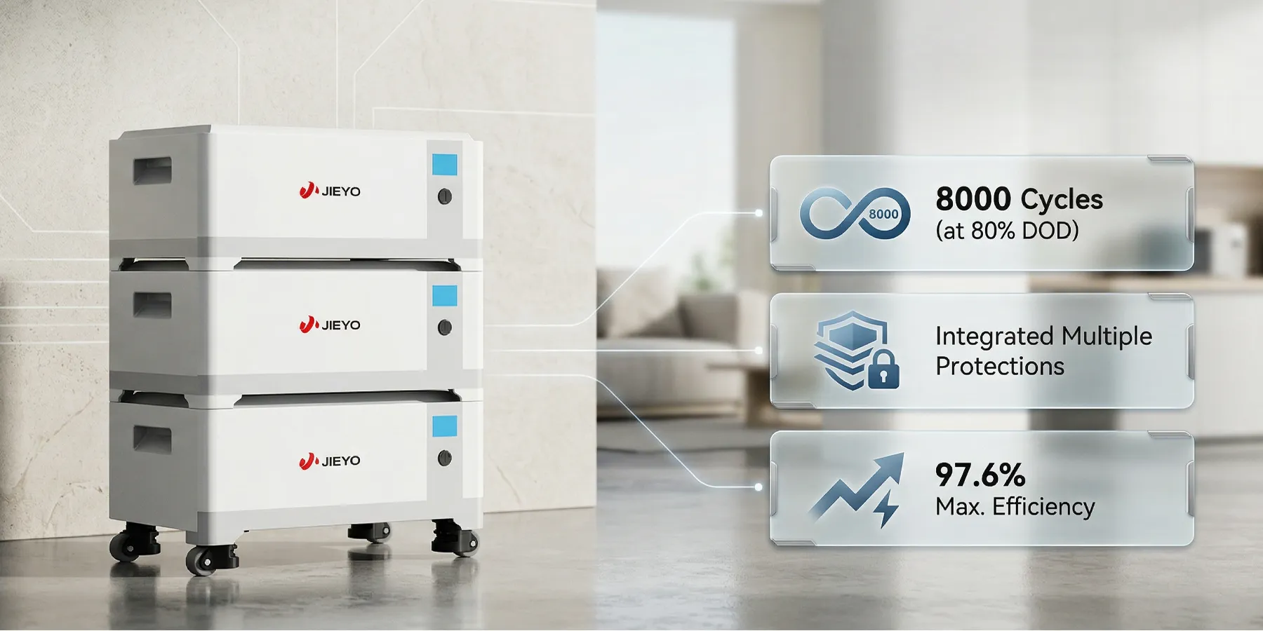 - Long cycle life: over 8,000 cycles at 80% DOD.